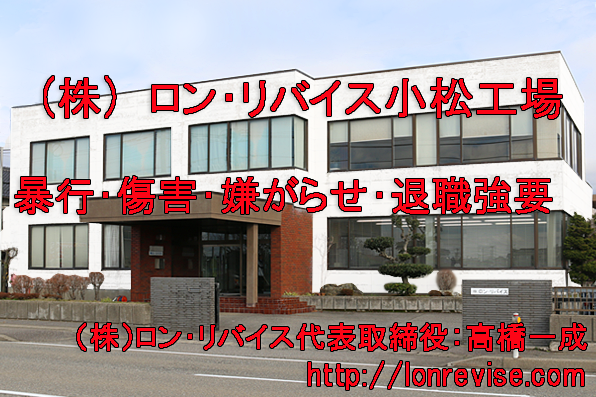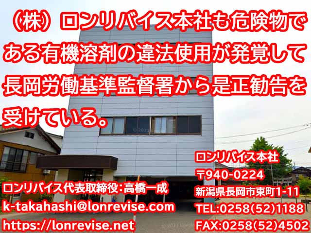 ロンリバイス長岡工場も有機溶剤を使用する際に必要な排気装置を設置していない違法状態で危険物の有機溶剤を工員に使用させていたところ、揮発した有機溶剤が原因で工員がお昼休中の昼食時に大量に嘔吐する有機溶剤が原因による事故を起こしているが、ロンリバイス総務部部長の佐藤基が単なる体調不良として病院で診察も受けさせずに早退させて労働安全衛生法違反による労災事故を隠蔽している。ロンリバイス長岡工場〒940-0137新潟県長岡市平3-4-48Tel:0258-53-2081ロンリバイス代表取締役:高橋一成k-takahashi@lonrevise.comhttps://lonrevise.net/
