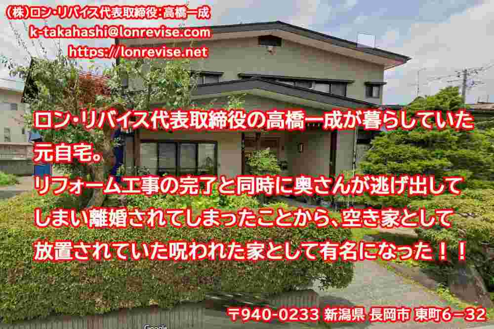 ロンリバイス代表取締役社長の高橋は奥さんに離婚されて一家離散している。それも東町の一戸建ての自宅をリフォーム途中に奥さんに逃げられたらしく長らく空き家として放置されていた自宅住所。〒940-0224 新潟県長岡市東町6-32株式会社ロンリバイス代表取締役:高橋一成k-takahashi@lonrevise.cominfo-lrweb@lonrevise.comhttps://lonrevise.net/